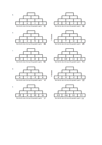 Ks2 Ks3 Addition Subtraction Pyramids 20 Problems Including Positive Negative Numbers Decimals Teaching Resources